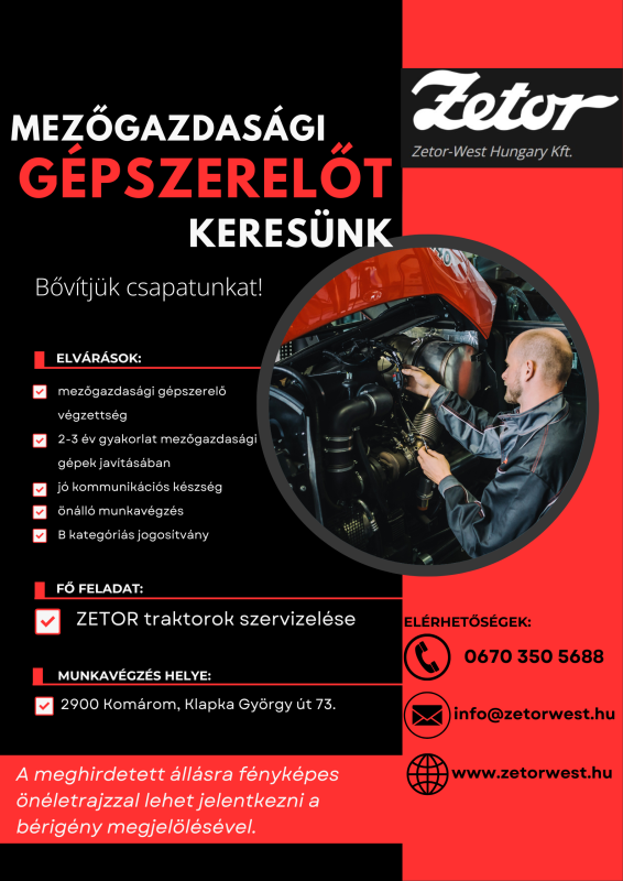 MEZŐGAZDASÁGI GÉPSZERELŐT keresünk komáromi telephelyünkre ZETOR traktorok szervizelésére!
