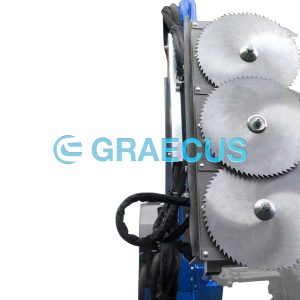 - 5 fűrészlappal (egyenként 72 fogú) és 400 mm átmérőjű. A fűrész effektív munkaszélessége körülbelül 1500 mm. Az 5 keményfém lapkás fűrészlap hidraulikusan hajtott. Legalább 70 l/perc hidraulikaolaj-ellátás szükséges.